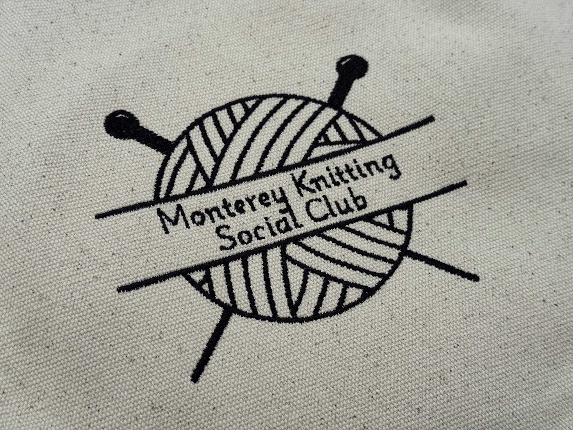 The bag features the Monterey Knitting Social Club logo embroidered in black thread on the front of the bag, with fabric stabilizer on the reverse side for added durability.